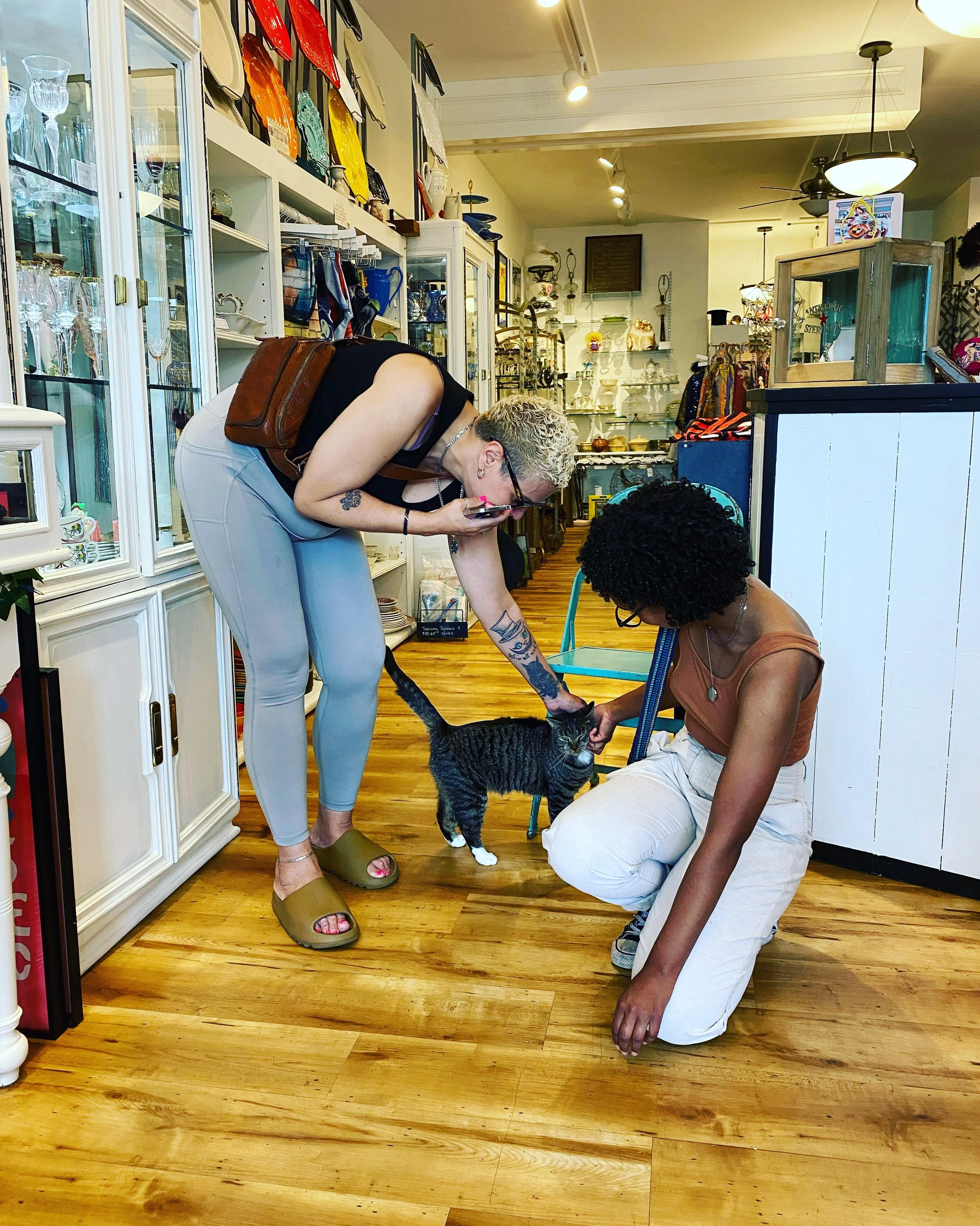 2 years ago a friend of mine texted me asking if I wanted a kitten. He had been hiking in South Carolina with his puppy and they had found this kitten that had been dumped and was sick and needed a home. When he texted me the photo of her little face I couldn’t say no. That’s how Alice arrived to us. After a month of healing she turned out to be a wonderful little girl and has grown up coming back-and-forth to the store with me. Alice has her own Instagram page and a huge fan club in Eastampton Massachusetts.