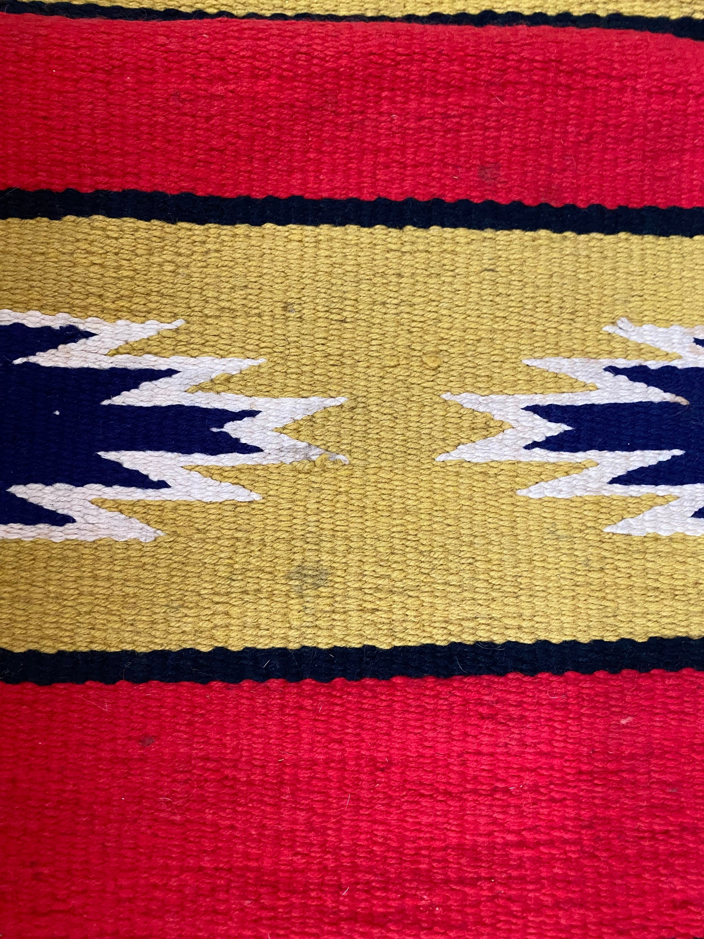 Recently Bought out auction as an Antique wool weaving from about the 1930’s. It was listed as Navajo but I think it might be Chimayo from New Mexico. I am on the East Coast in New England and do not have experience with Native American rugs so please do your own research and ask me any questionsThere are some tiny spots that I have not tried to get out. Bound edges with tassels on each corner. Great condition! Measures 57” by 27”. Red, yellow, black and cream geometric pattern.